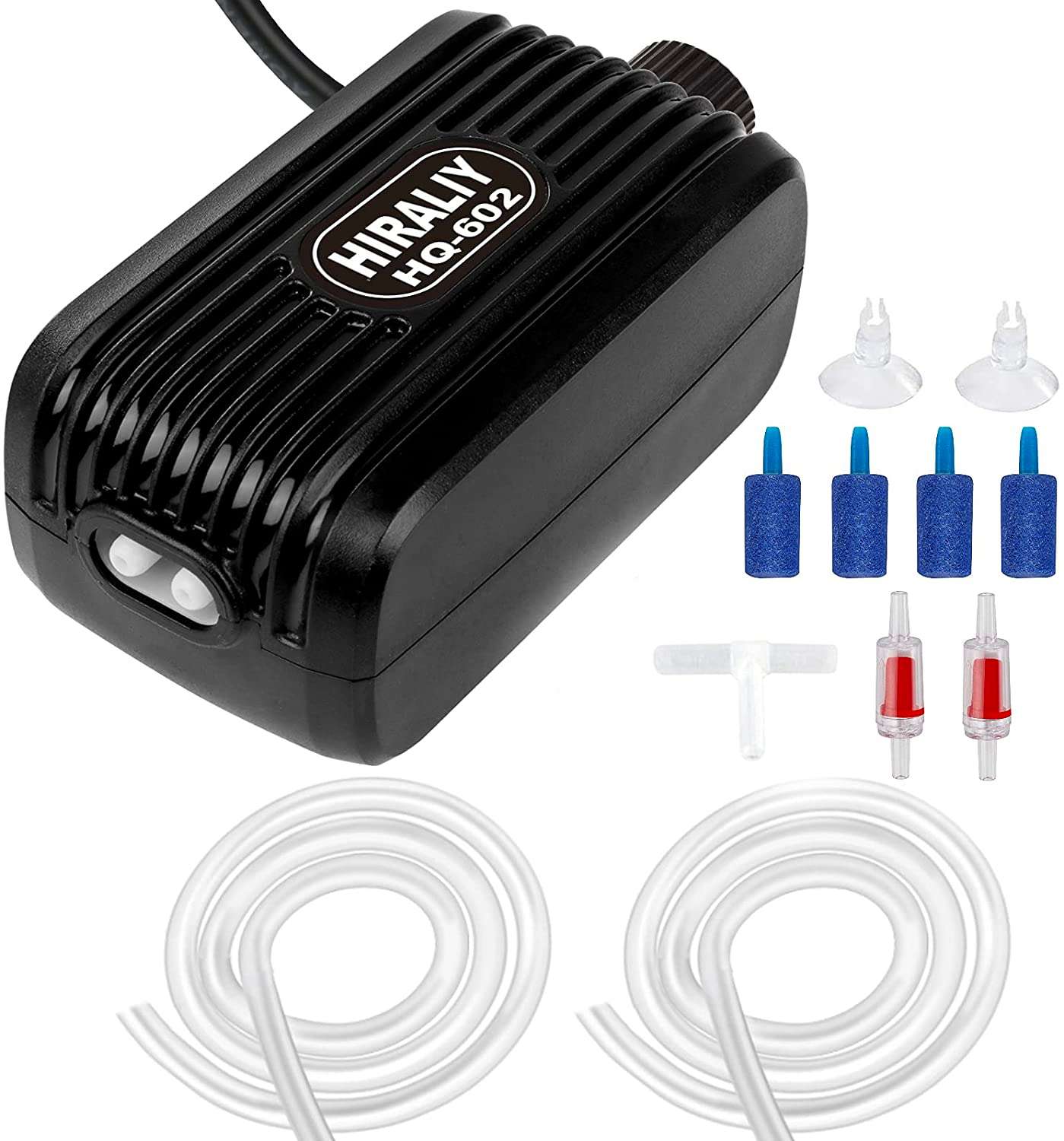 我们推荐HIRALIY水族馆气泵为大多数水族馆,因为它有有用的功能,伟大的配件,和多种方式配置它与各种各样的水箱大小的工作。hiraly泵是一个紧凑的盒子,具有双排气口,橡胶脚来压制振动,和一个调节流量的旋钮。