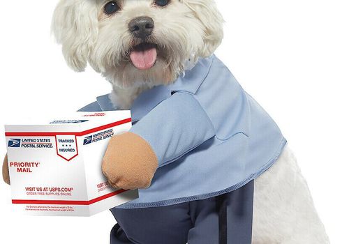 这种小装扮一眼就能认出来,但它远非典型!这是一套迷你版的美国邮政制服,这套狗狗服装非常准确。旁观者会立刻认出这是美国邮政总局的标志——从制服本身(蓝色条纹裤子、衬衫和帽子)到附在制服上的美国邮政总局的可爱的精确盒子。这个盒子连着两个“手臂”,这两个“手臂”从服装上伸出来,就像你的狗叼着盒子一样。