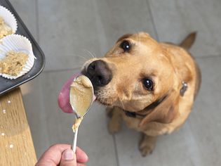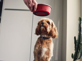 厨房里一个人拿着碗里的狗粮,黄色拉布拉多看着它。
