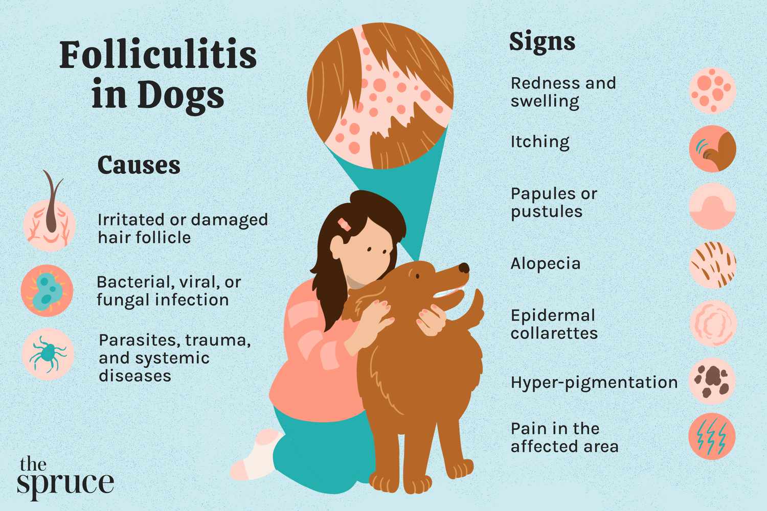 患有毛囊炎的狗身上会有一个或多个皮肤损伤。它可能开始于皮肤上一个看起来像粉刺的小凸起(称为丘疹)。这个部位可能会变得更隆起并充满脓液(称为脓疱)。毛囊炎可引起瘙痒、疼痛和脱发(脱发),在狗的身体的一个或多个区域有一个斑块的外观。有些狗会出现硬皮状或片状的圆形皮肤病变,称为表皮夹胸。色素沉着(皮肤上的黑斑)也可能发生在受影响的皮肤区域。