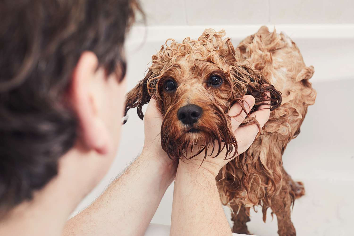 - 使用温水to lukewarm water to gently and thoroughly soak your dog's coat. Make sure the water is not hot or too warm to the touch. Hot water may burn your dog. In addition,dogs can overheateasily, so hot or very warm water can cause heat exhaustion.
