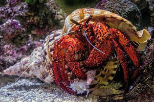 万圣节寄居蟹(Ciliopagurus strigatus)有一个身体和腿是明亮的橙色和红色带。它长到大约1.5英寸大。它吃很多种类的藻类,包括红泥藻.